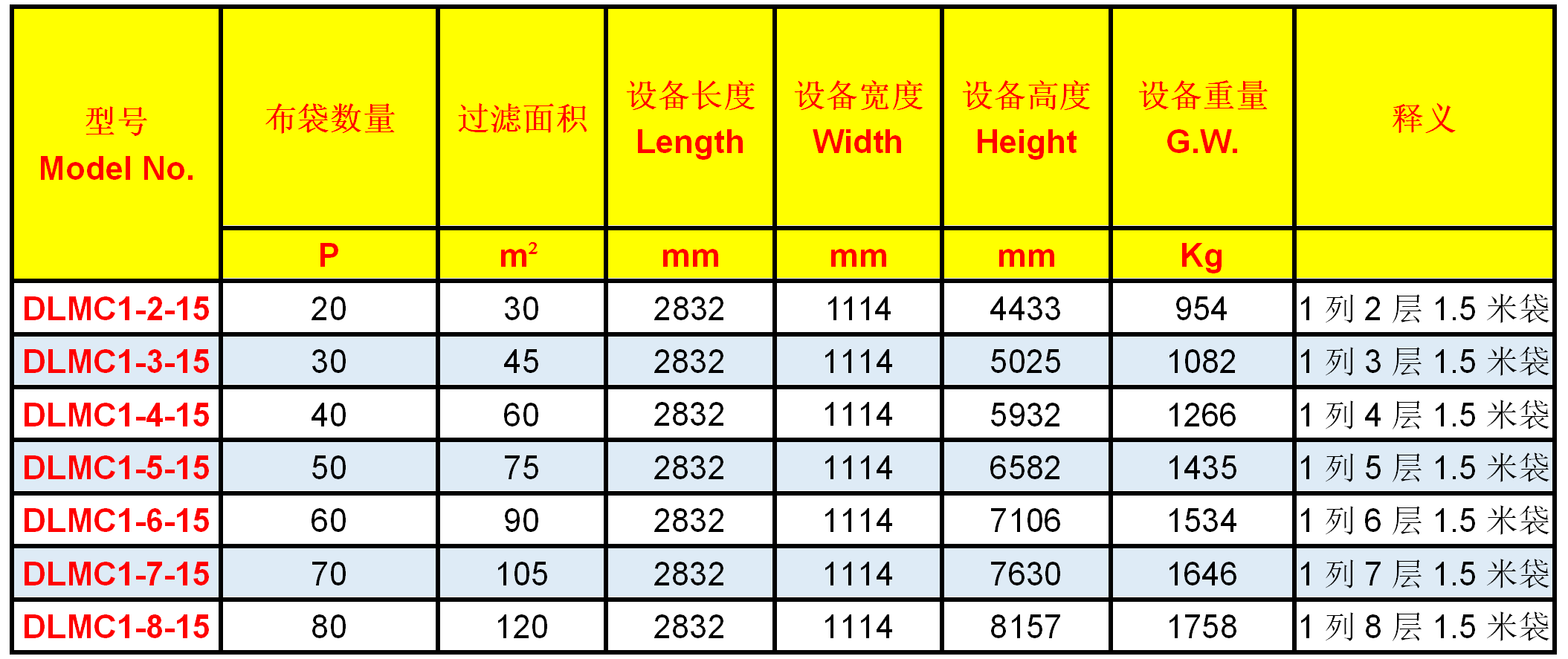 8、以DLMC4-8-15為例,表示4個8層的模塊,采用1.5米濾袋,總共320袋。體積為2832*4114*8157MM。