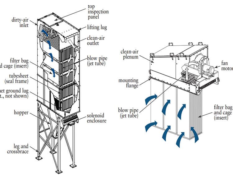 扁布袋除塵器分為DLMC模塊型與DLMV一體機型(倉頂)