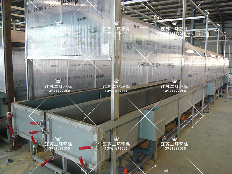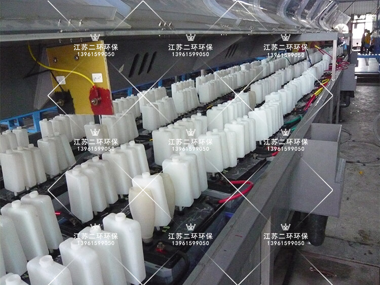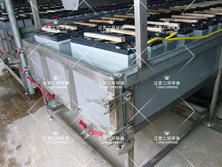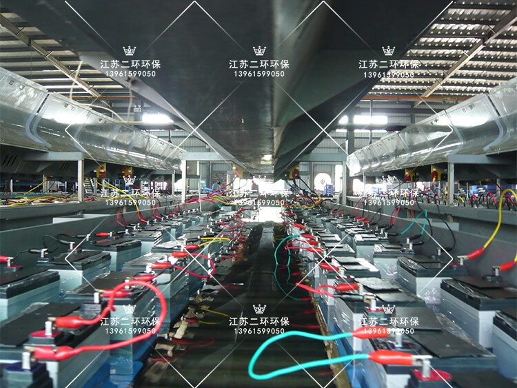 電池化成線,又稱為電池外內化成酸霧回收裝置。電池內化成充電過程中,加酸通電發生化學反應,生成鉛氧化物活性物質。整個系統有酸槽、酸霧吸罩,酸霧風管、酸霧凈化塔構成。類似酸洗槽、磷化槽、電解槽裝置。