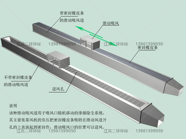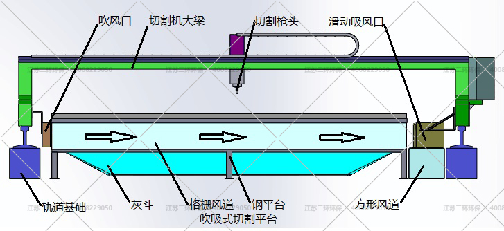 4、移動的行程導軌一側安裝抽風管道,并有相應的風門調節,在哪個點切割時,對應該點的風閥打開,通過管道連接除塵器抽走煙塵。